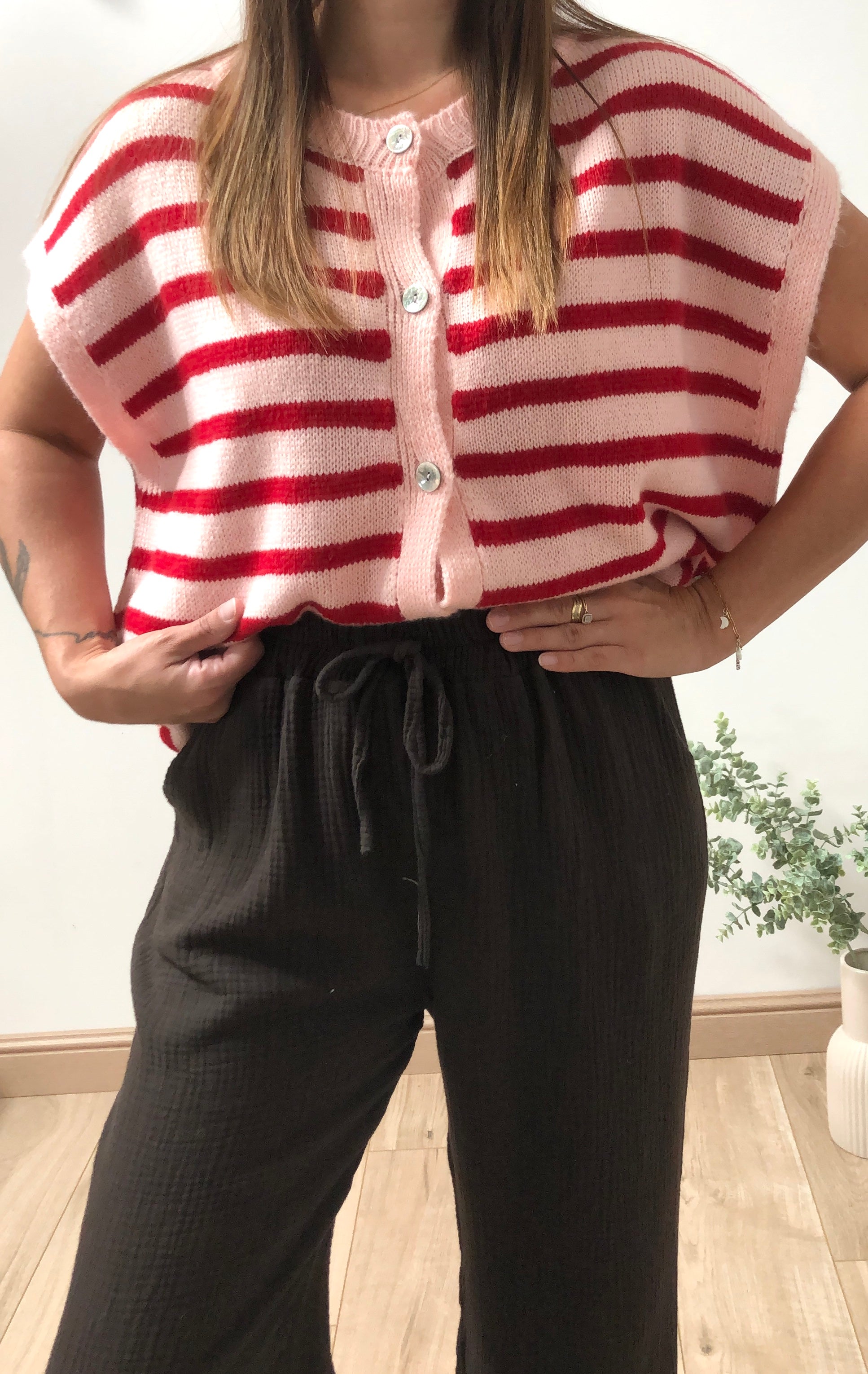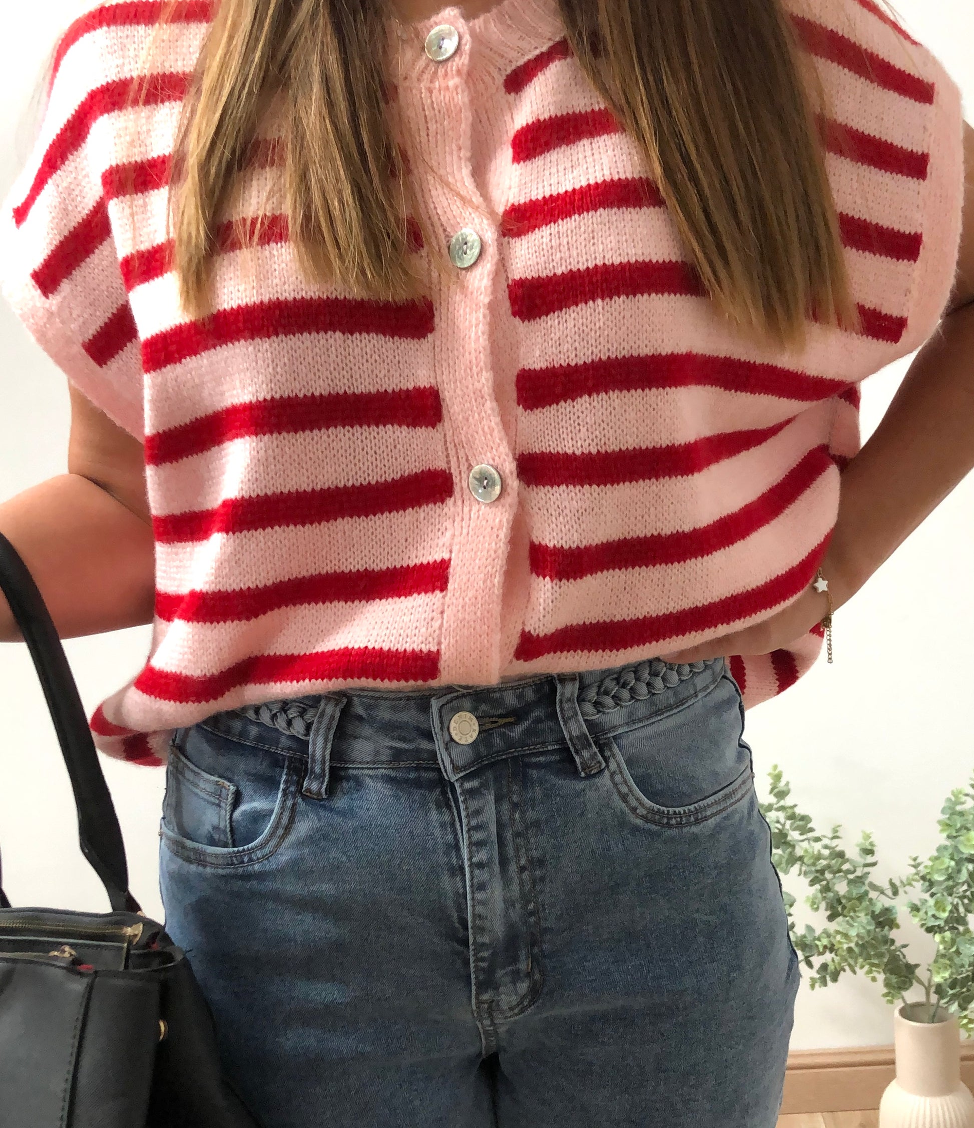 Ce gilet boutonné cosy avec sa matière ultra douce, à rayures horizontales de couleurs rose/rouge, ajoute du peps à une tenue simple. Avec sa coupe oversize il s'adapte autant avec un short pour l'été, autant avec un pantalon pour la mi-saison.