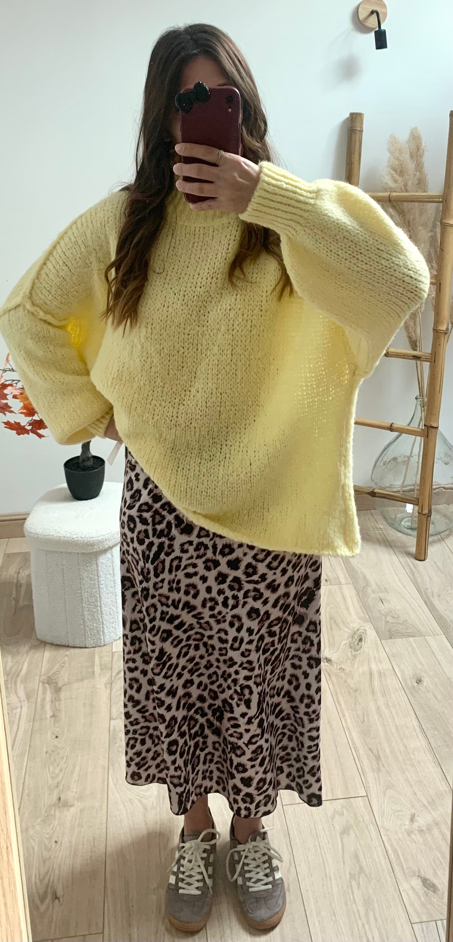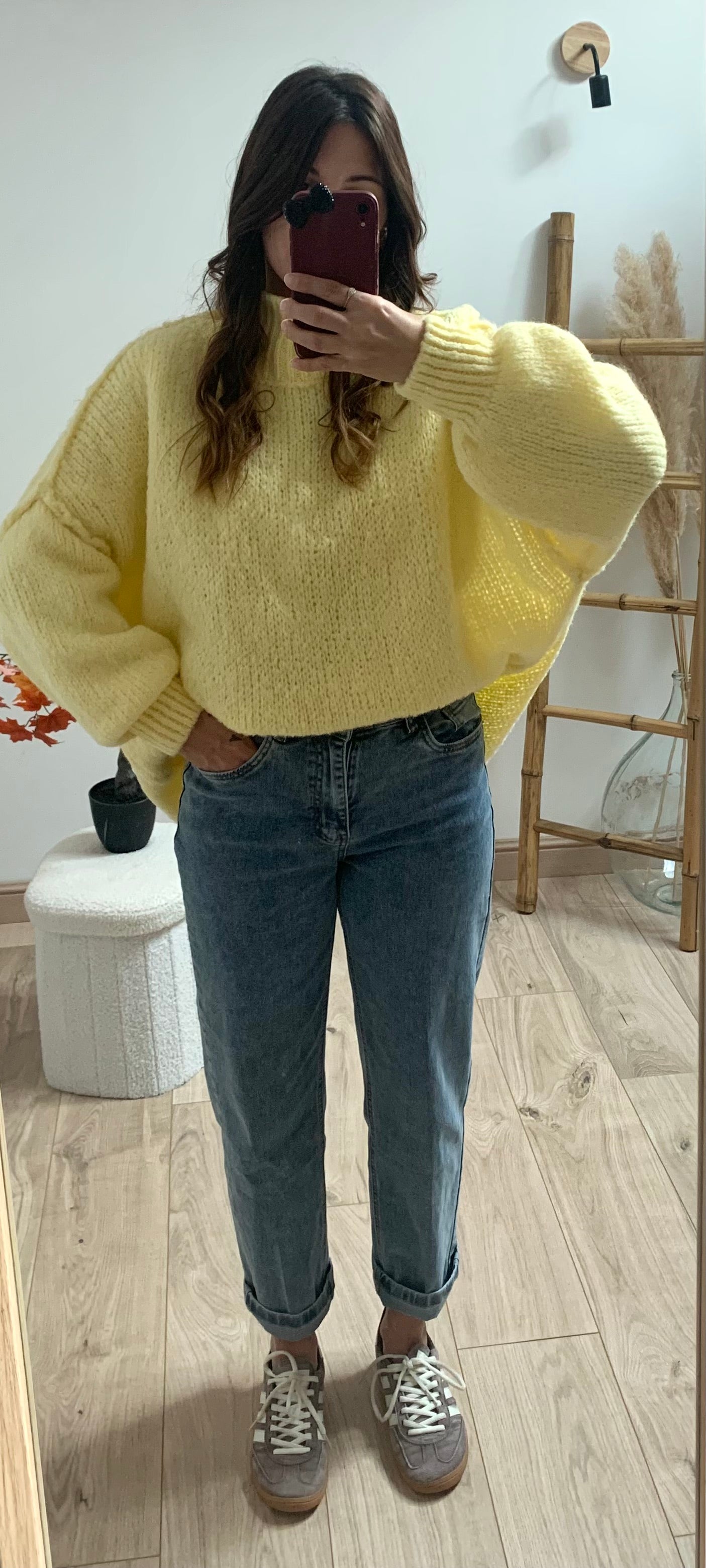 Ce pull oversize couleur jaune est le cocon parfait pour affronter les journées fraîches avec style. Sa coupe ample et ses manches larges apportent une allure décontractée et tendance, tandis que sa couleur s'accorde facilement à toutes vos tenues d'automne. Ce pull peu s'associer à une jupe longue ou bien par dessus une robe pour un contraste de textures, ou le porter simplement avec un jean pour un look cosy